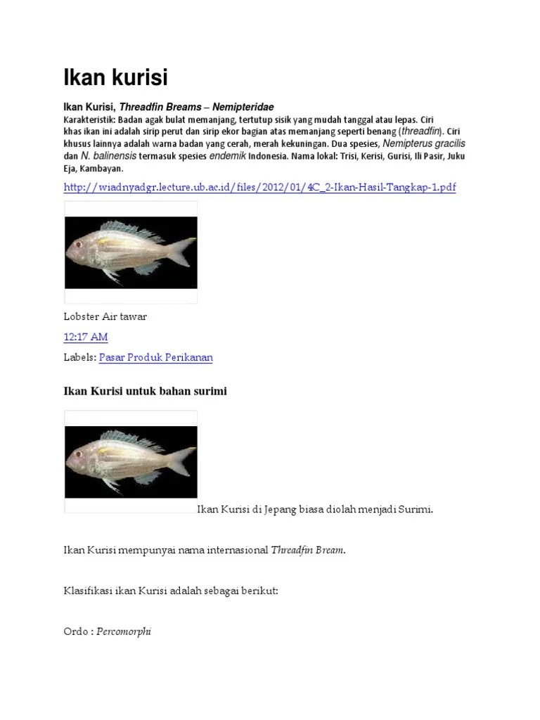 Limbah insang ikan kurisi (nemipterus japonicus) belum dimanfaatkan di masyarakat pesisir tuban untuk dikonsumsi apalagi untuk dijadikan . Beli produk ikan kurisi giling berkualitas dengan harga murah dari berbagai pelapak di indonesia. 158 resep ikan kurisi ala rumahan yang mudah dan enak dari komunitas memasak terbesar dunia! Kadar air surimi ikan kurisi sebesar 75,6 %, kekuatan gel 2452,10 g/cm2 dan derajat putih 80,51. Ikan kurisi merupakan salah satu komiditi ikan yang cukup mudah ditemui di beberapa daerah indonesia.